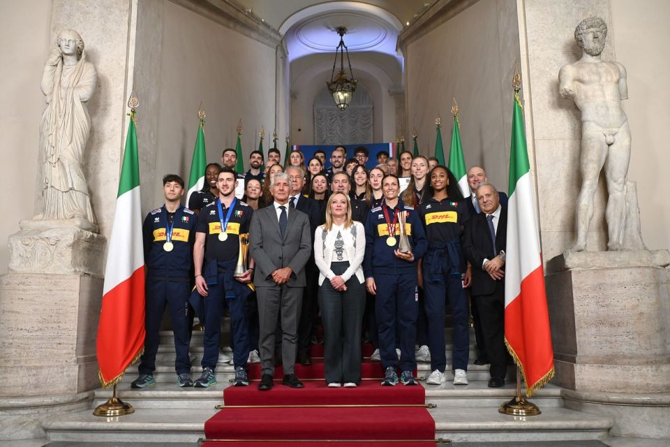 北京时间10月9日消息,在2025年世锦赛双双夺魁的意大利男女排国家队于8日在罗马先后获得意大利总统马塔雷拉和总理梅洛尼接见。今年世锦赛意大利女排时隔23年斩获队史第二冠、意大利男排成功卫冕夺下队史第五冠。意大利男女排双双登顶,在排球世锦赛历史上时隔65年后再度出现了由同一国家球队包揽男女冠军的情形。这两支荣耀之师在回国后也受到礼遇,再度获得国家元首接见。